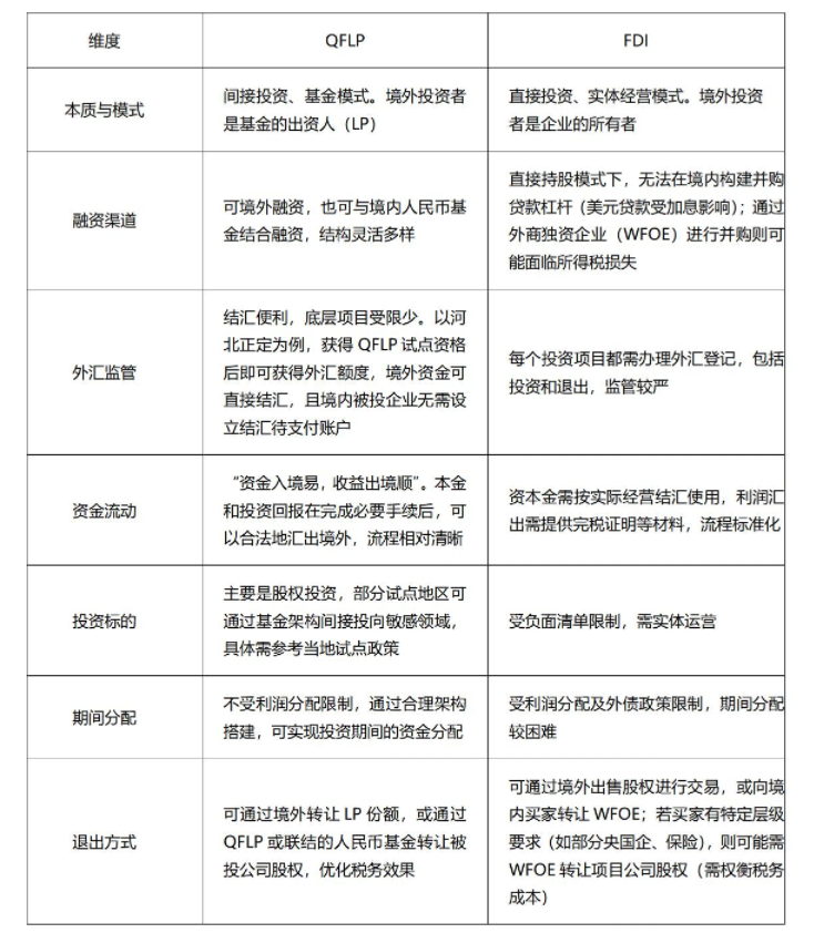 QFLP作为中国推进制度型开放的重要实践,为境外资本进入国内市场提供了更加灵活、高效的通道。与FDI相比,它在资金流动、退出机制和架构设计上更具弹性。这一政策既简化了外资投资的流程,又有效促进了跨境资本的流动。由于不同地区的QFLP试点政策和审核标准存在差异,投资者在架构设计和合规落地之前,需向当地相关部门咨询政策细则。