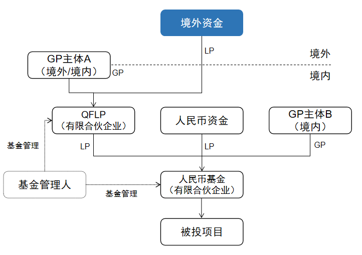 境外资本通过QFLP与境内人民币基金的合作日渐增多,常见的结构是QFLP作为“Feeder”基金,和境内募集的资金共同设立人民币基金,并利用该基金进行项目投资。